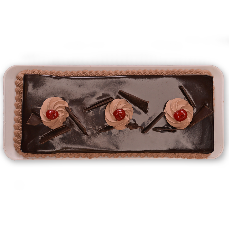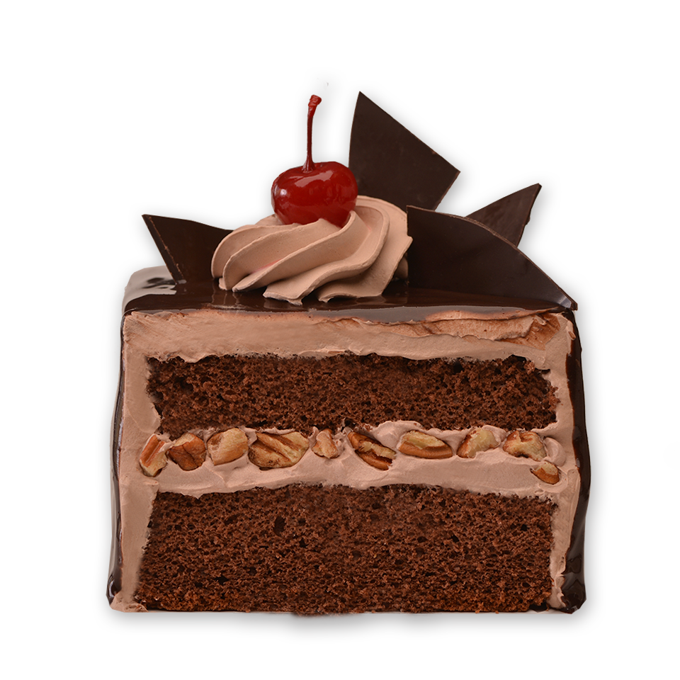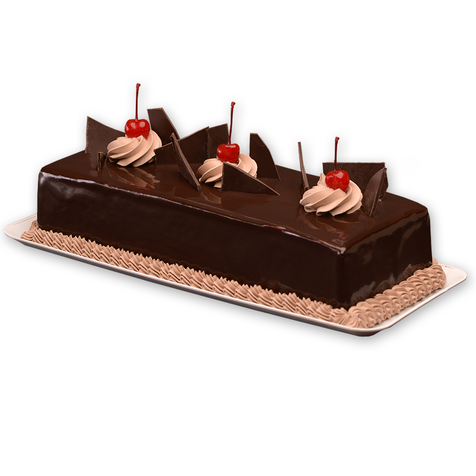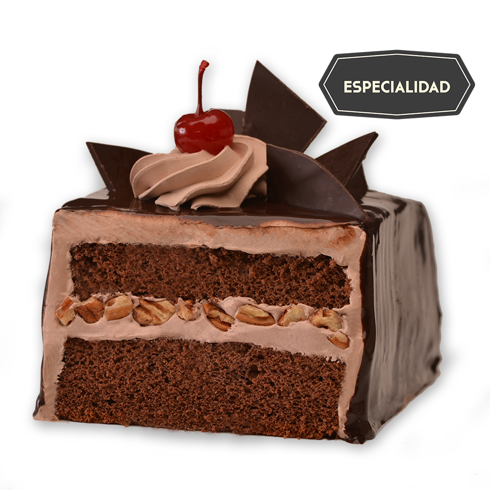 Pastel esponjocito sabor chocolate, relleno de nueces tostadas, embebido en Tres Leches con betún de chocolate con cobertura de chocolate oscuro.