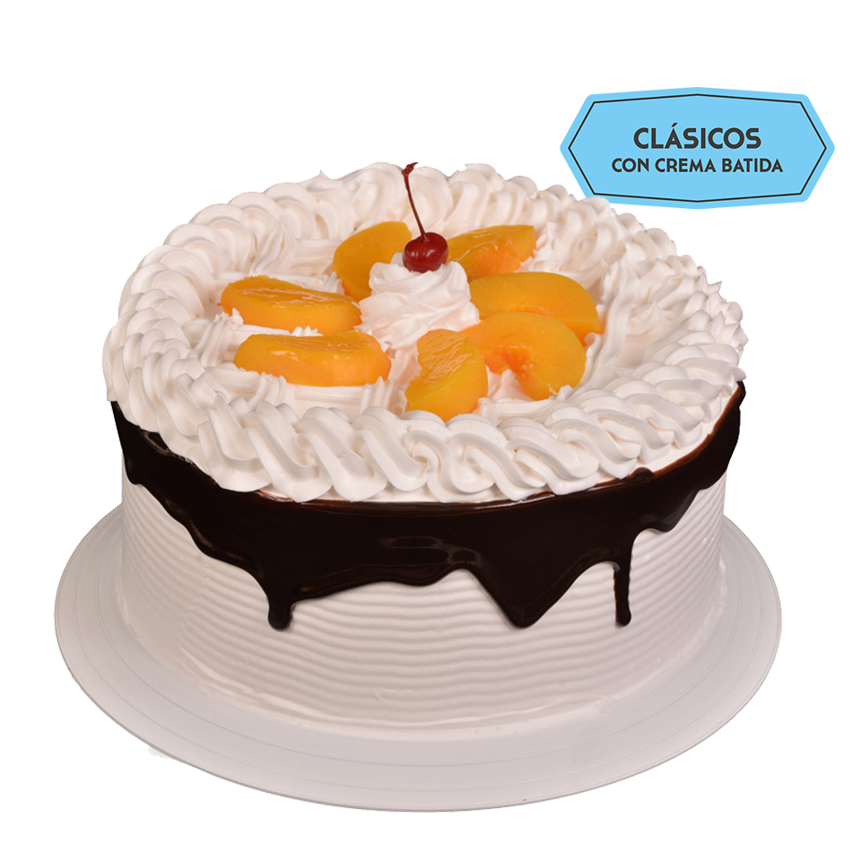 Pastel esponjocito sabor vainilla embebido en jarabe de Tres Leches relleno de duraznos con betún Clásico de Crema Batida Natural
