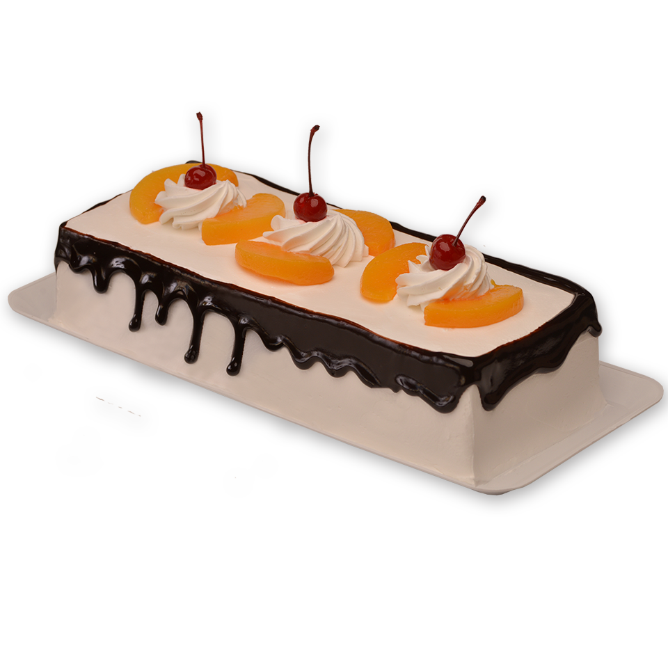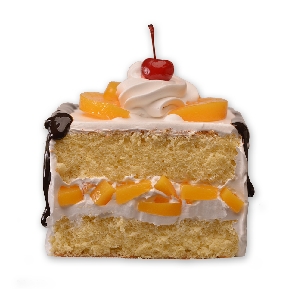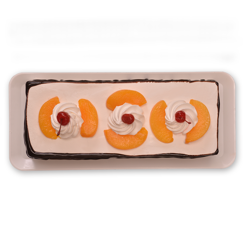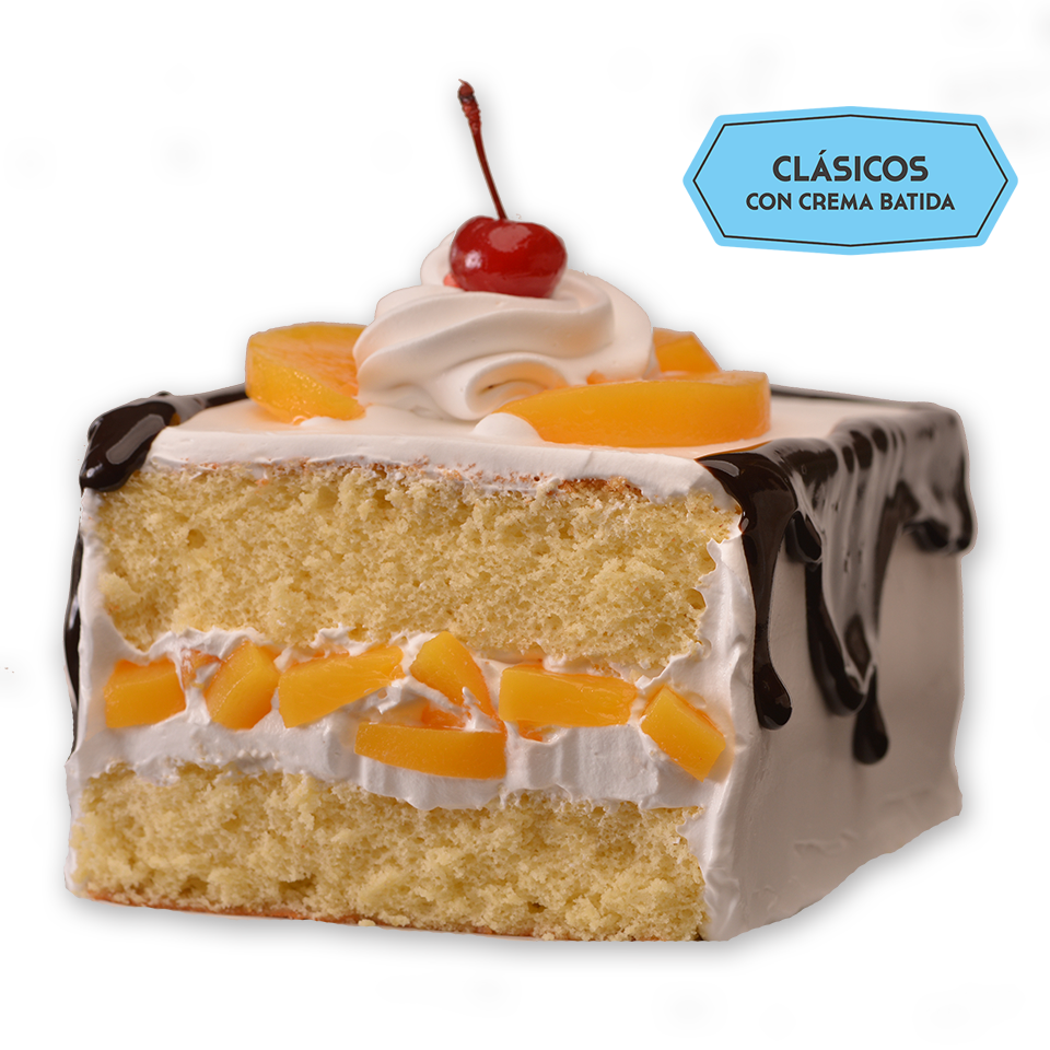 Pastel esponjocito sabor vainilla, relleno de duraznos, embebido de Tres Leches con betún Clásico de Crema Batida Natural.